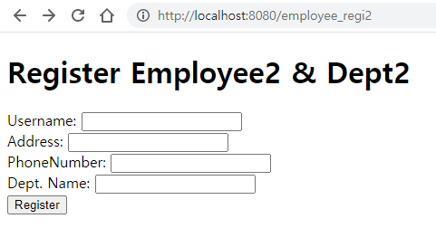 localhost:8080/emplyoee_regi2로 접속 시 @GetMapping에 정의된 함수를 이용하여 employee_dept_input2.html을 보여 주도록 합니다.