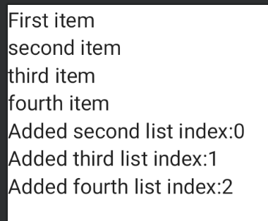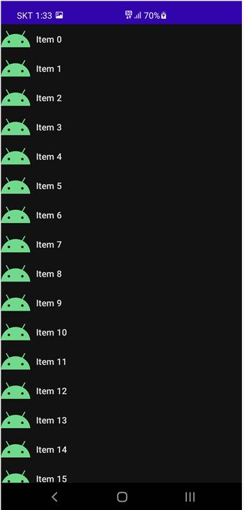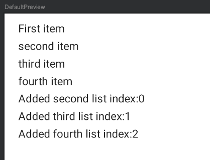 item을 표시하기 위해 item, items, itemsIndexed 등 다양한 형태의 override 함수를 제공합니다. 위와 같이 만들었다면 아래와 같이 배치한 순서대로 출력됩니다. [8]