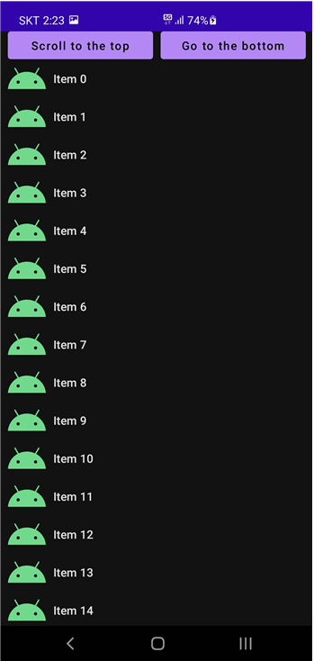 Top으로의 이동은 smooth scroll을 이용했지만 아래로 이동하는 건 scrollToItem()으로 단번에 이동하도록 했습니다. 물론 이 함수 역시 suspend function이므로 coroutineScope내부에서 호출해야 합니다.