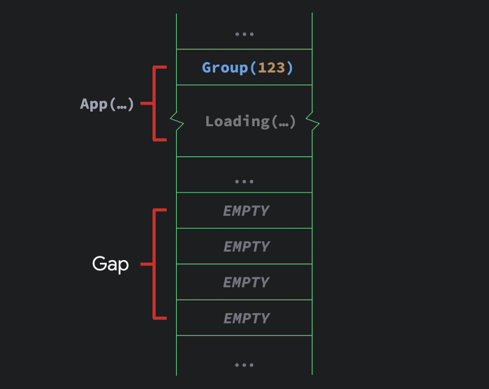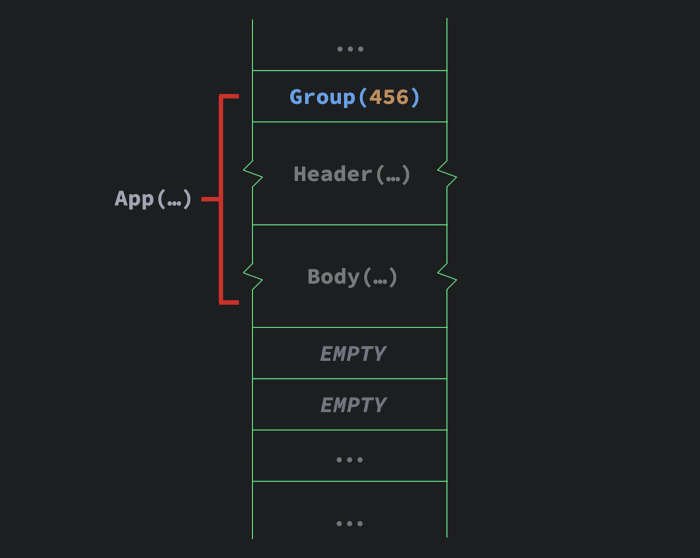 사실 이렇게 저장된 group들은 공간을 많이 차지합니다. 이 group들은 dynamic UI에서 이동과 추가를 관리하기 위해 존재해야 하는데, 실제 컴파일러는 UI structure를 변경할 것 같은 코드들을 알고 있기 때문에 조건적으로 이런 그룹들을 추가합니다. 정리하면 대부분의 이런 group들은 컴파일러에서 필요로 하지 않기 때문에 많은 group들이 실제 이 메모리 구조에 추가되지는 않습니다.