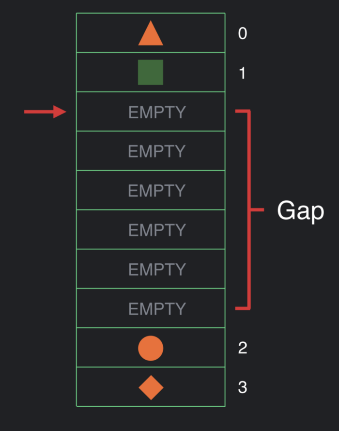 그럼 새로운 데이터를 넣을 gap이 생기기 때문에 이 공간에 다시 필요한 데이터를 채워 나갑니다. 여기서 중요한 점은 Gap을 이동시키는 연산이 O(n)인 것만 제외하면, 그 외 데이터의 get, move, insert, delete의 연산은 BigO가 상수값이므로 매우 빠릅니다.