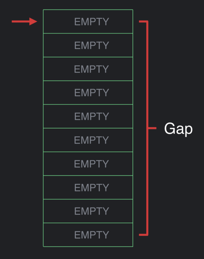 Gap buffer는 index나 cursor를 갖는 구조로 flat array로 구성됩니다. 이 flat array는 여기에 담는 data보다 큰 사이즈를 가지며 남는 공간은 Gap 이 됩니다.