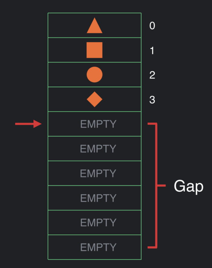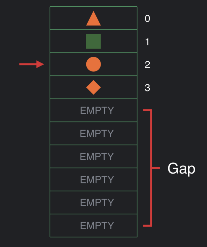 만약 UI의 구조가 변경되어 데이터를 array에 넣어야 한다면 위 그림처럼 변경되어야 되는 지점으로 cursor를 이동시킵니다. 그리고 cursor가 위치된 해당 부분으로 Gap을 이동시킵니다.