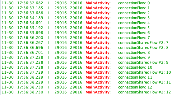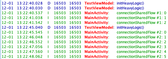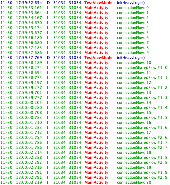 여기서 "initHeavyLogic()" 이란 로그는 flow가 시작되면서 찍는 로그입니다. 총 세 개의 flow가 collect 되고 있지만 원본 cold stream flow가 시작되면서 하나가 출력되고, 첫 번째 sharedFlow가 생성되면서도 출력됩니다. 또한 두 번째 sharedFlow는 기존에 생성된 flow를 공유하게 되므로 추가적으로 생성되지 않습니다. 이는 위에서 설명했던 single instance of flow가 생성되고 여러 개의 구독자가 추가 생성 없이 결과를 동일하게 전달받음을 확인할 수 있습니다.