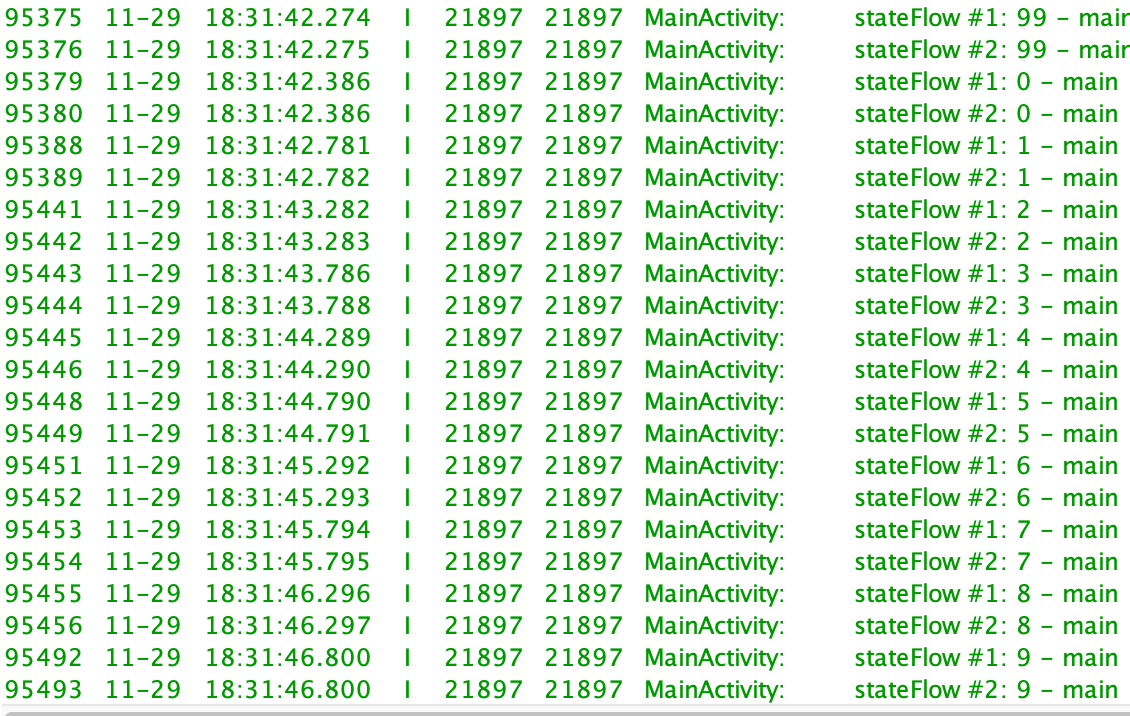 즉 현재 collect가 호출되면 현재 데이터부터 수신되기 시작하며, 여러 곳에서 collect를 호출하면 collect를 시작한 시점에서 각각의 데이터를 전달받기 시작합니다. 따라서 아래와 같이 동일한 stateFlow를 두 곳에서 collect 한다면 두곳 모두 동일한 데이터를 전달받습니다.
