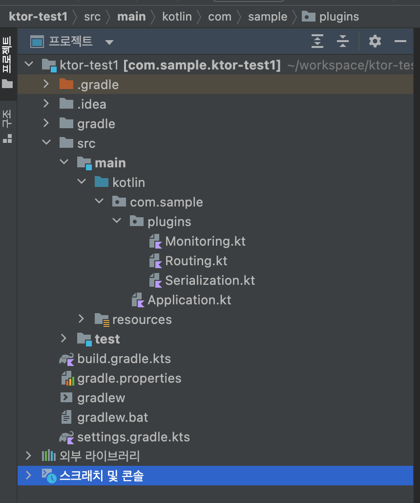 안드로이드의 build.gradle과 크게 다르지 않습니다. kotlin은 1.6.10을 사용하고, main class는 "ApplicationKt"로 되어 있습니다. 그리고 plugin에서 선택했던 기본값들이 dependecies에 포함되어 있는 걸 확인할 수 있습니다. 혹시 생성시점에 빼먹은 plugin이나 추가할 게 있다면 직접 추가하면 됩니다.