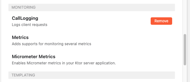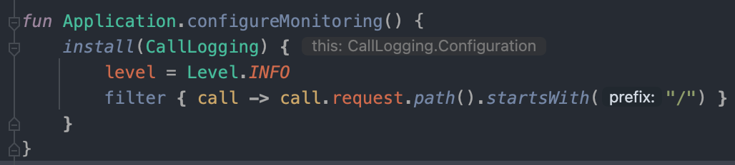 이중 configureMonitoring() 함수는 서버에 접속되는 client 로그를 남기기 위해서 plugin에서 추가했던 CallLogging을 설정합니다. Application에서 바로 사용할 수 있도록 extention function을 이용하여 아래와 같이 작성되어 있습니다.