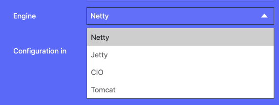 Ktor version은 현재 1.6.7이 최신이나(2022.01.24일 기준), sample project 이므로 2.0.0-beta-1을 선택했습니다. 또한 Web service를 제공할 Engine은 Netty로 선택했습니다. 그 이외에도 아래 그림처럼 Netty, Jetty, CIO, Tomcat을 선택할 수 있습니다.