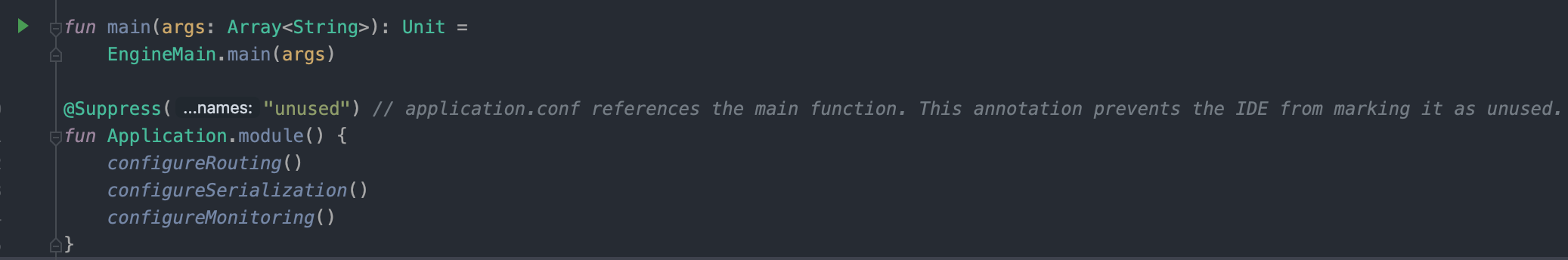 만약 프로젝트 생성 시 Configuration을 "code"가 아닌 "HOCON"을 선택했다면 Application.kt의 파일 내용이 달라집니다.