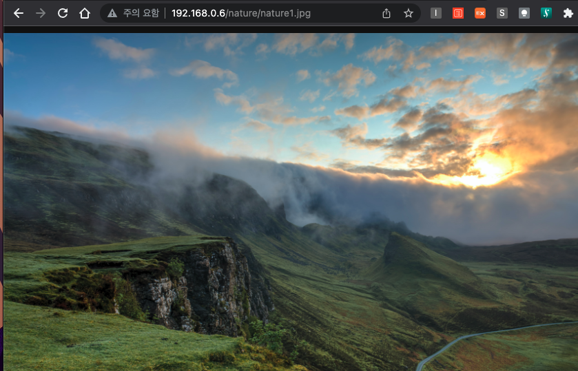 따라서 이미지 url은 "http://192.168.0.6/nature/nature1.jpg"의 경로로 접근하게 됩니다. 하지만 프로젝트의 기본값을 그대로 유지할 경우 실제 이미지에 접근하기 위해서는 "http://192.168.0.6/static/nature/nature1.jpg"으로 접근해야 합니다.