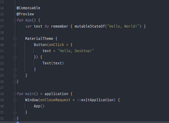 간단하게 "Hello, Desktop"이라는 Button을 만들고, 클릭 시 "Hello, World!"로 변경하도록 되어 있습니다. android와 똑같네요.