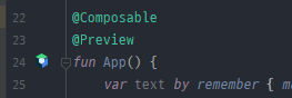 main.kt 파일의 @Preview 함수의 왼쪽에 preview 아이콘이 생깁니다. 클릭하면 안드로이드처럼 오른쪽에서 미리보기로 화면을 볼 수 있습니다.