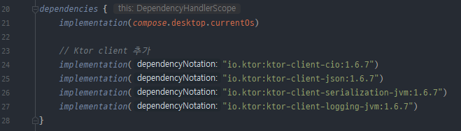 Android에서 http api를 사용하고 위해서 ktor-client를 사용했습니다. 여기서도 동일하게 사용할 예정이므로 필요한 library를 build.gradle.kts에 추가합니다.
