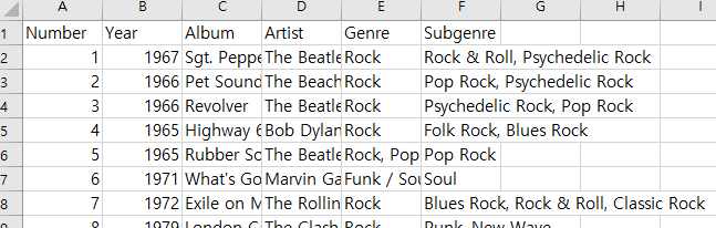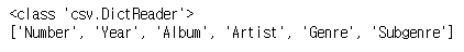 filednames는 엑셀의 상단 제목( columns)를 출력합니다. 실제 albumlist.csv 파일은 아래와 같은 내용을 담고 있습니다.