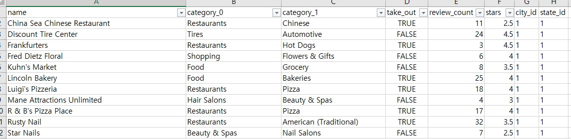 이 데이터의 특징으로는 가장 기본이 되는 "yelp_data" sheet에 각각 다른 sheet의 id값을 물고 있는걸 알수 있습니다. DB의 join을 위한 key 같네요.