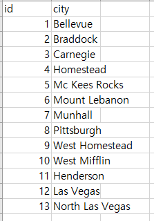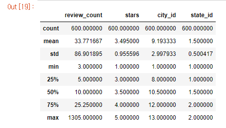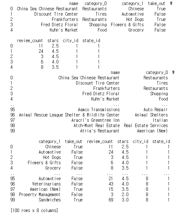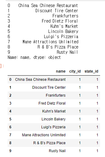 이렇게 읽어온 이후 parse()를 통해 특정 sheet의 내용을 가져올 수있습니다. 예제에서는 yelp_data, cities 두개의 sheet의 데이터를 읽어 dataframe에 담았습니다. 마지막 print문의 실행값은 아래와 같습니다.