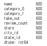 각 컬럼이 가지는 row 개수를 반환합니다. 여기는 전부 데이터가 채워져 있는상태이므로 전부 600개라고 반환 됩니다.