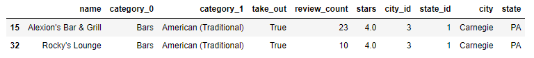 만역 복합적인 where 조건을 주려면 동일하게 여러개의 boolean index를 생성하면 됩니다. 카네기에 있는 Bars만 찾고 싶다고 한다면, 아래와 같이 질의할수 있습니다.