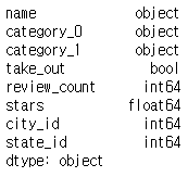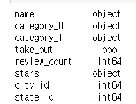 때로는 string의 함수로 문자열을 편집하고 싶다면 그보다 먼저 type을 변경해야 합니다. stars (별점) 항목은 float64로 되어 있습니다. 한번 string으로 변경해 봅니다.