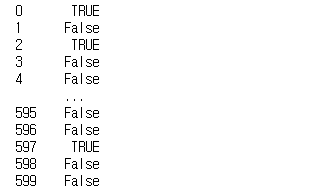 이 pitts의 type은 pandas의 Series이고, 600개의 각 라인별로 이게 참인지 거짓인지에 대한 결과가 저장됩니다.