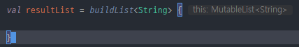 IDE에서 Lambda 영역의 receiver가 MutableList<String>으로 되어 있음을 알려 줍니다. 하지만 builder 추론을 이용하면 lambda 영역에서 사용된 값을 이용하여 generic type이 추론됩니다.