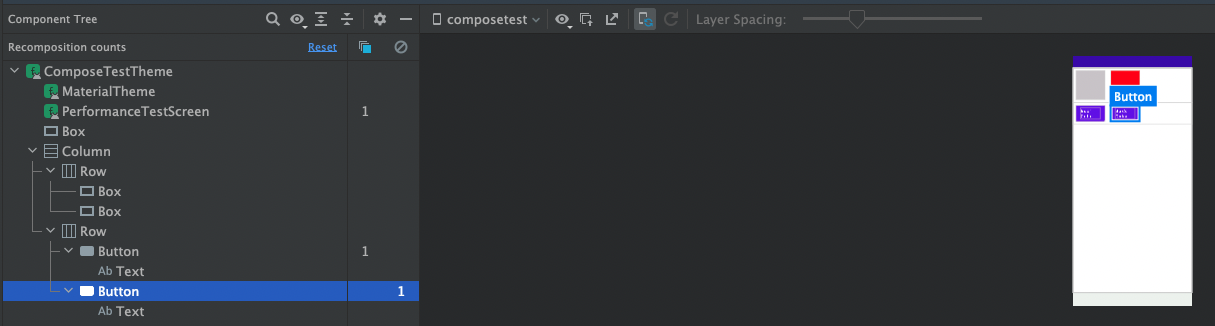 캡쳐된 이미지의 상태에서는 첫번때 버튼을 클릭하여 해당 Button에서 recomposition이 1회 발생했습니다. 이때 클릭시 bgColor1 state 변수에 저장된 색상을 변경하므로 이와 가까운 최상단 composable function이 PerformanceTestScreen() 함수부터 1회 recomposition이 발생합니다.