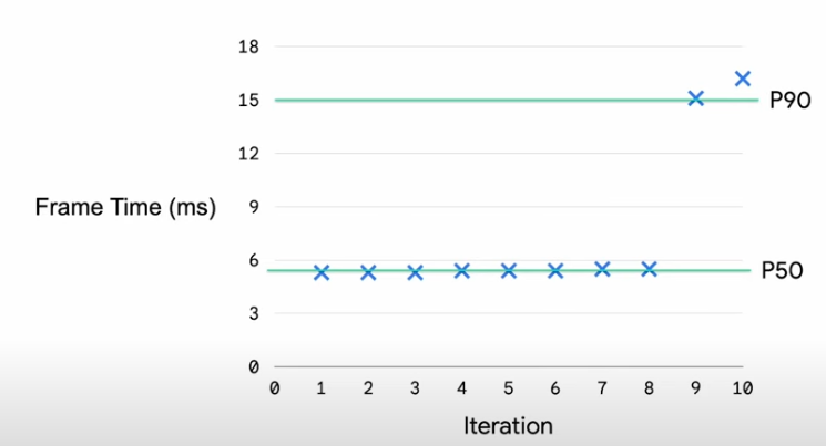 25.2ms - 90%의 확률로25.2ms 이전에 그려짐. - 10%의 경우가 frame을 처리하는데 25.2ms 이상이 걸림. |