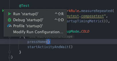- packageName: 기본적으로 benchmark 모듈은 원래 app의 process와는 다른 process에서 시작됩니다. 따라서 benchmark 대상이 되는 앱의 package명을 명시합니다.