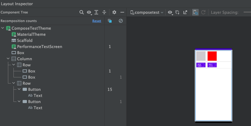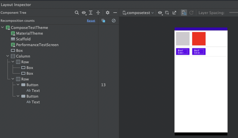 같은 동작을 진행하지만 button 클릭에 따른 recomposition (Ripple 효과로 인해 여러번 recompose됨)은 해당 버튼에서만 발생합니다. 즉 부모가 되는 PerformanceTestScreen()은 아예 recomposition 대상에서 제외되며, 실제 색상이 바뀌는 Box의 경우 recomposition의 세단계중 앞단 두단계를 건너뛰고 Draw(3단계)만 수행되면서 layout Inspector에 잡히지 않습니다.