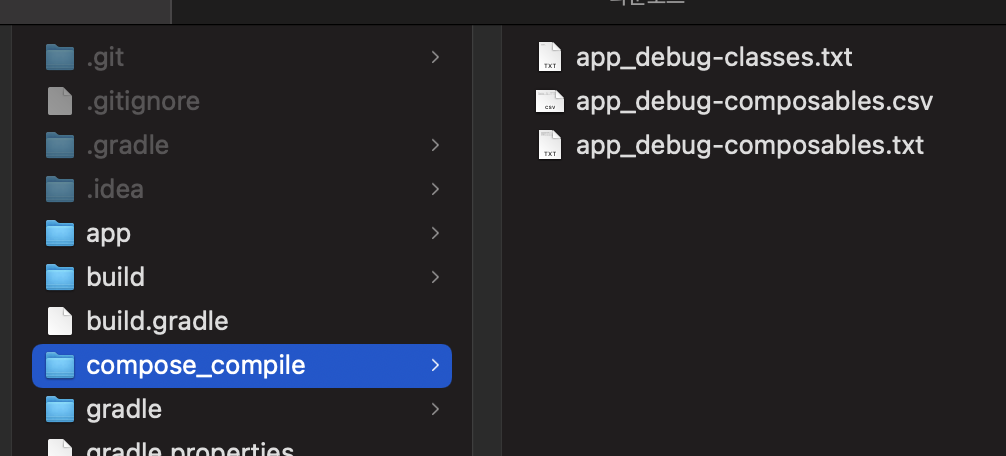 - <modulename>-composables.txt: composable 함수들의 restartability / skippability를 나타냅니다.