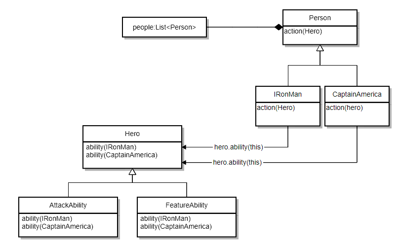 Person(element) interface에 각각의 ability를 수행할수 있는 action() 이란 함수를 만듭니다. 이때 함수의 인자에는 실제 동작(algorithm)을 담고있는 객체(hero)가 담겨져서 넘어 옵니다. 각 Person의 concrete한 객체들에서는 hero.ability() 함수를 함수를 호출하면서 자신 (this)를 넘겨 주도록 합니다.