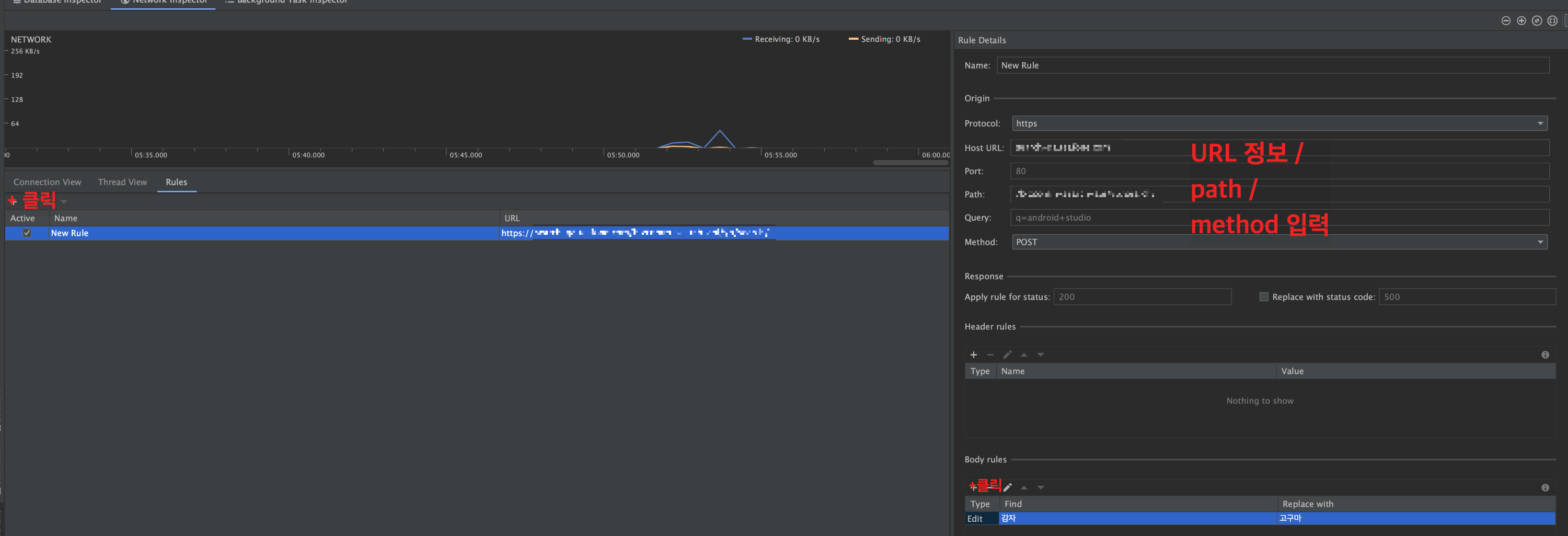 Rule을 추가한 이후에 url / path / method 정보를 입력합니다. 저는 Body의 정보중에 "감자" -> "고구마"로 바꿨습니다. 따라 해당 API를 호출하여 결과에 "감자"라는 단어가 포함된 경우 실제 단말에는 고구마로 보이게 됩니다. 여기서는 단어를 치환했지만 아예 응답 json 통째로 변경하거나, rule을 여러개 추가하는것도 가능합니다.