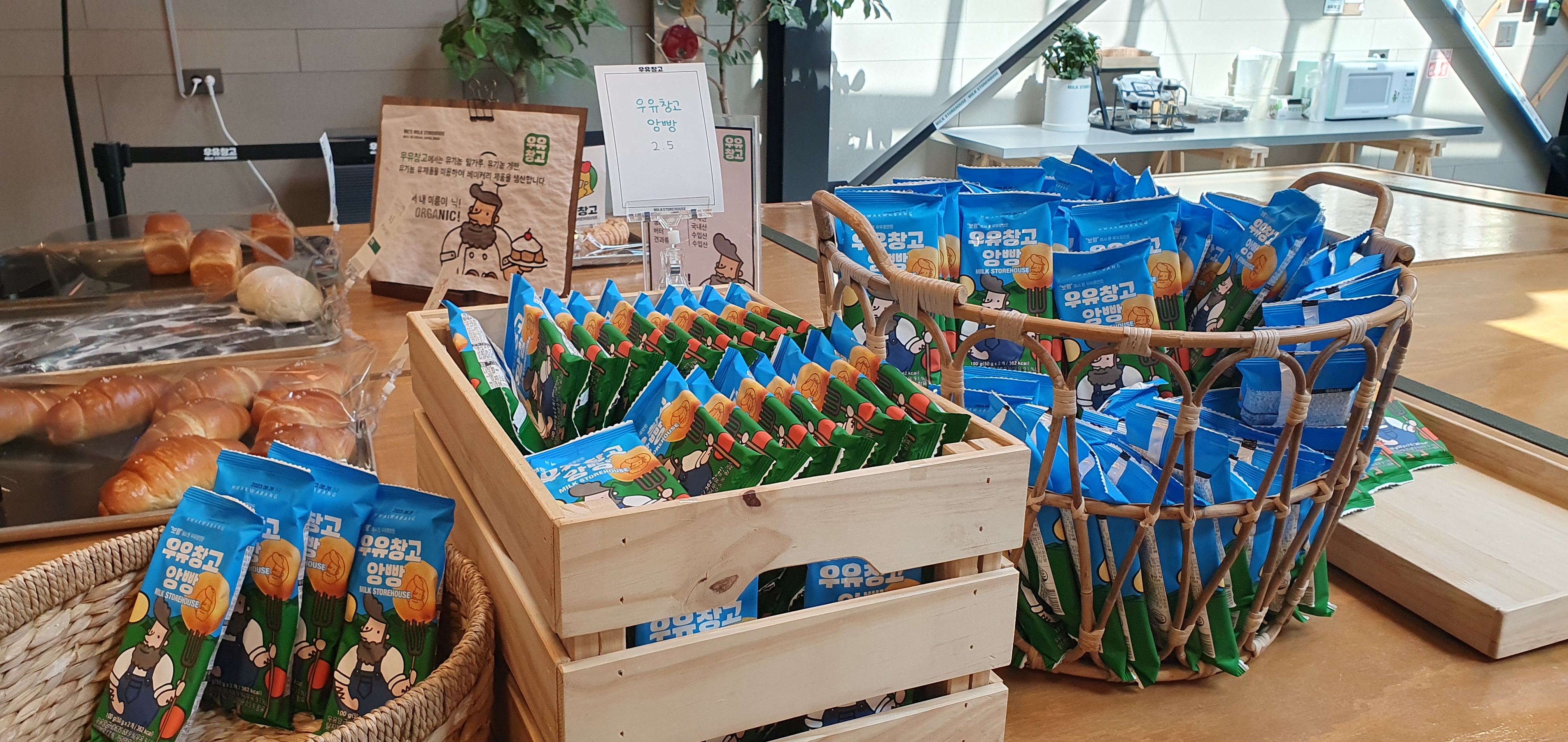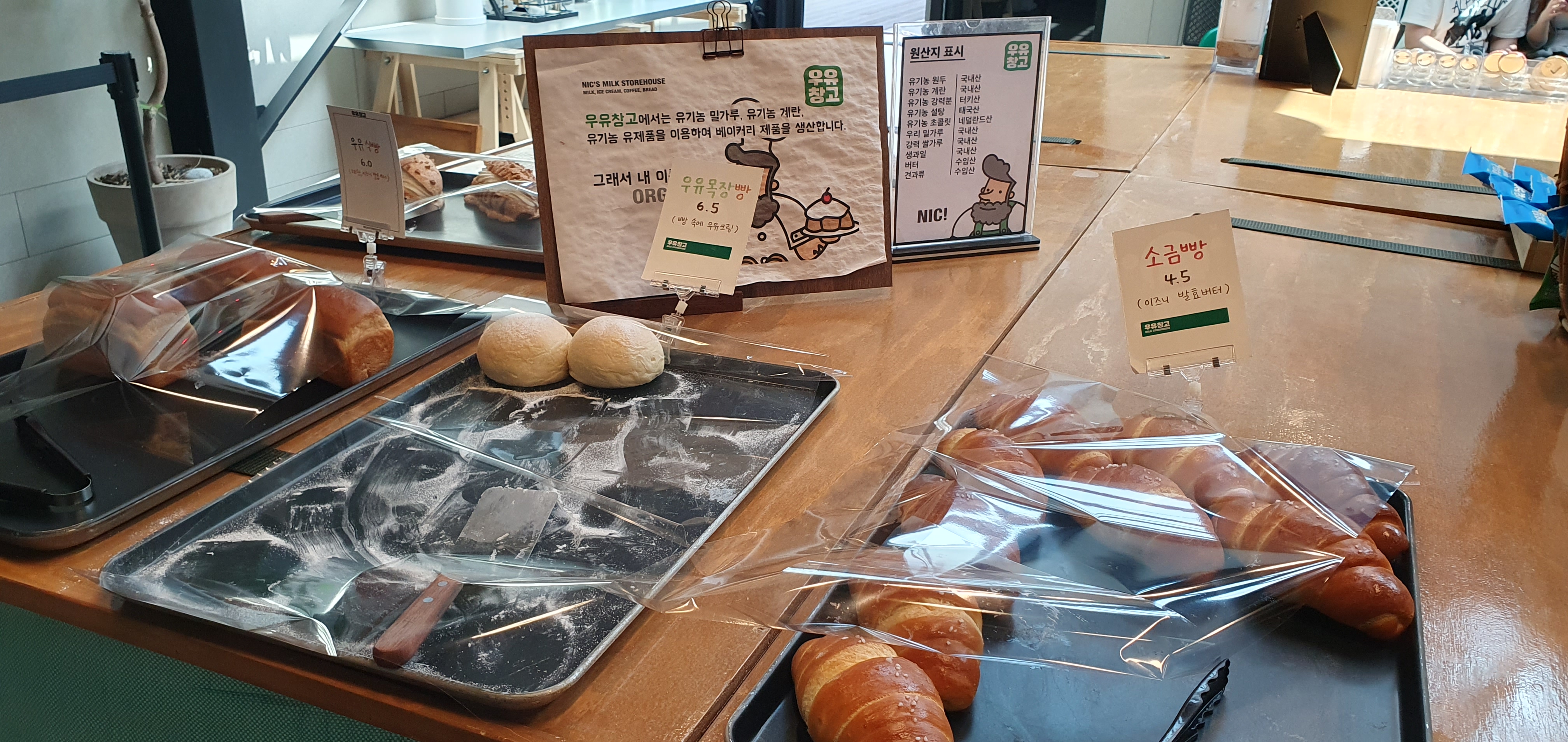 아이들이 체험을 하는 동안 저는 카페에 왔습니다. 역시나 유제품으로 만들어진 과자나 빵을 팔고 있었는데, 소금빵 하나만 사서 먹어봅니다. 크림가득 빵도 있었는데, 너무 살찔 것 같은 비주얼이라..ㅠ.ㅠ