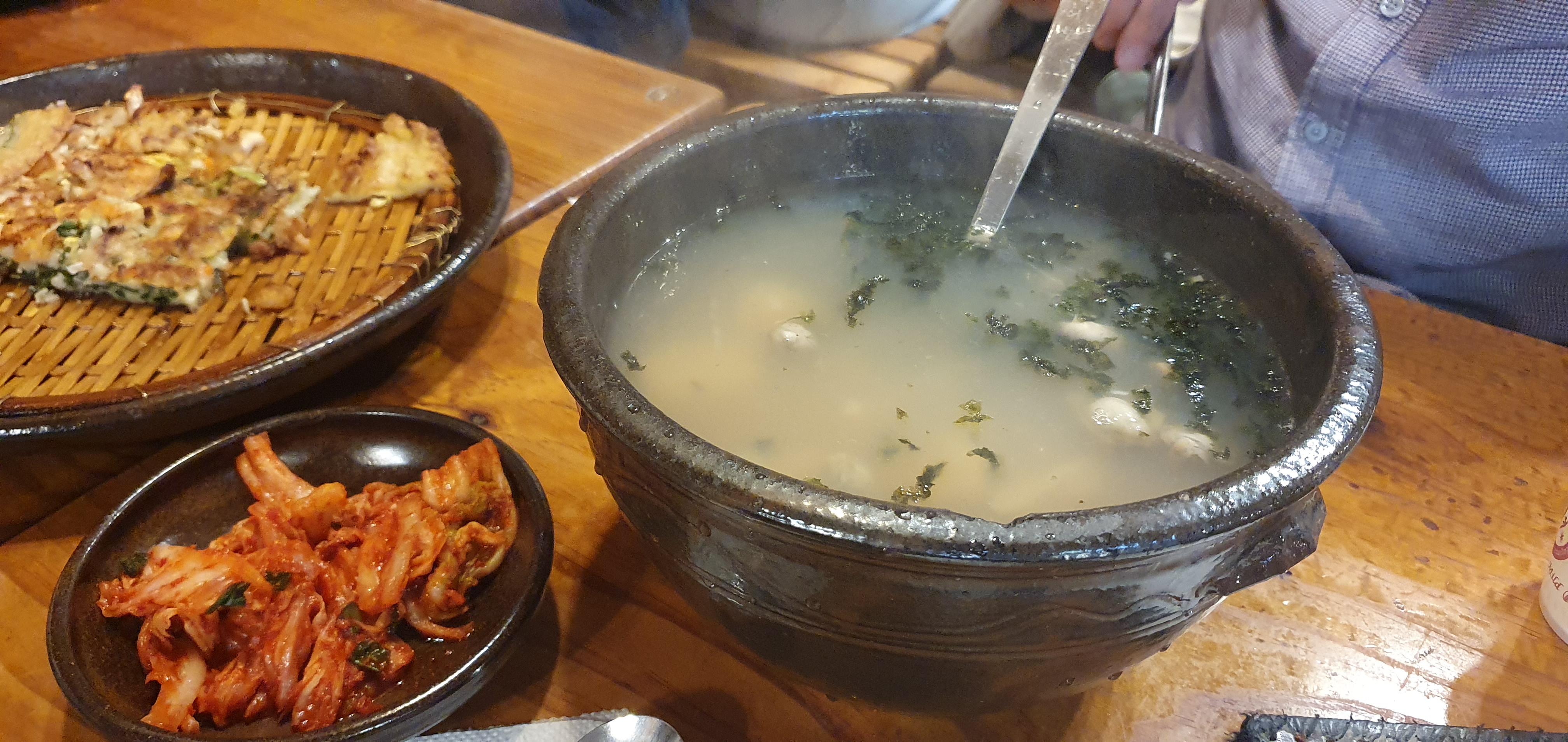 기본적으로 굴이 들어있어, 시원한 국물맛과 함께 수제비의 쫀득함이 너무나 좋습니다. 수제비는 손으로 한점 한점 뜯어서 만들어야 하기 때문에 점심시간에는 식당들이 기피하는 메뉴인데, 점심으로 수제비를 먹을수 있어 너무 좋네요.