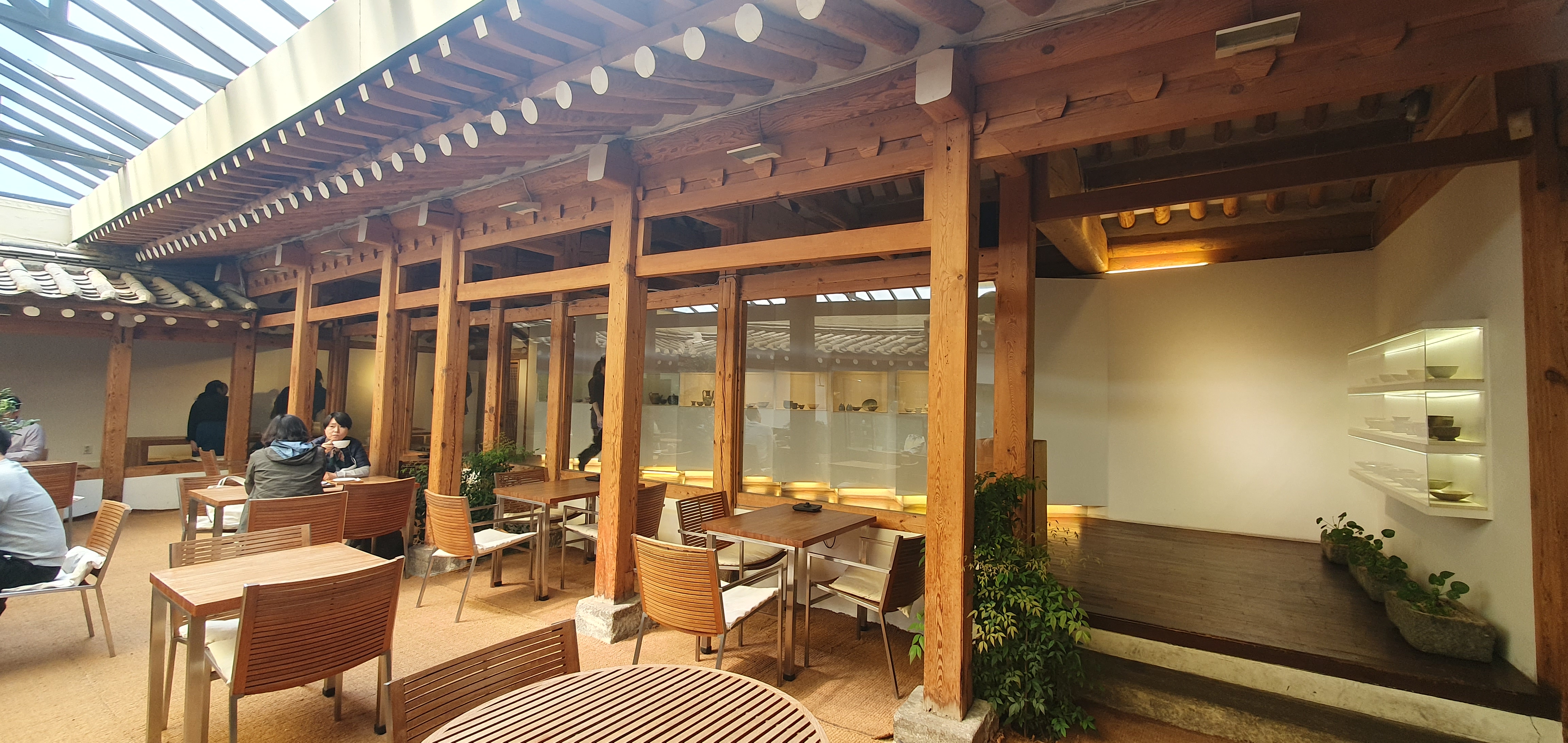사각 한옥의 마당에 지붕을 달아 홀을 만들었습니다. 바닥에 멍석이 깔려있어 한옥 분위기가 물씬 납니다. 채광도 잘 되어 날씨좋은 날에 가면 밝은 자연광 아래 차를 즐길수 있습니다.