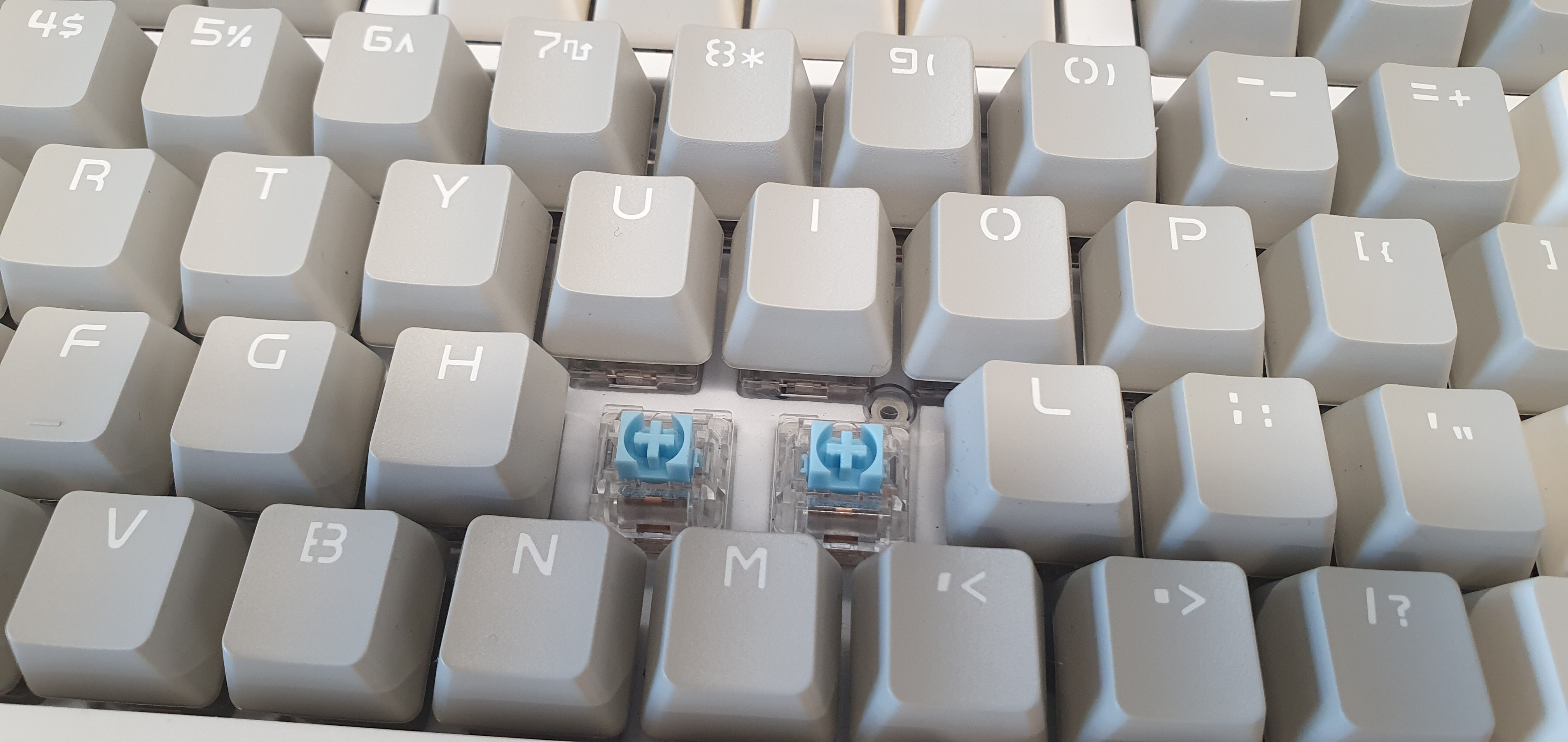 키캡을 제거해 보면 파란색 스위치가 보입니다. 파란색이지만 청축이 아닙니다. LANGTU에서 직접 만든 축 같은데, 청축처럼 딸깍거림은 없으나, 적축이나 갈축처럼 아예 소음이 없지는 않습니다. 솔직히 사무실에 쓰기는 시끄러운데, 타건감은 너무 좋았습니다.