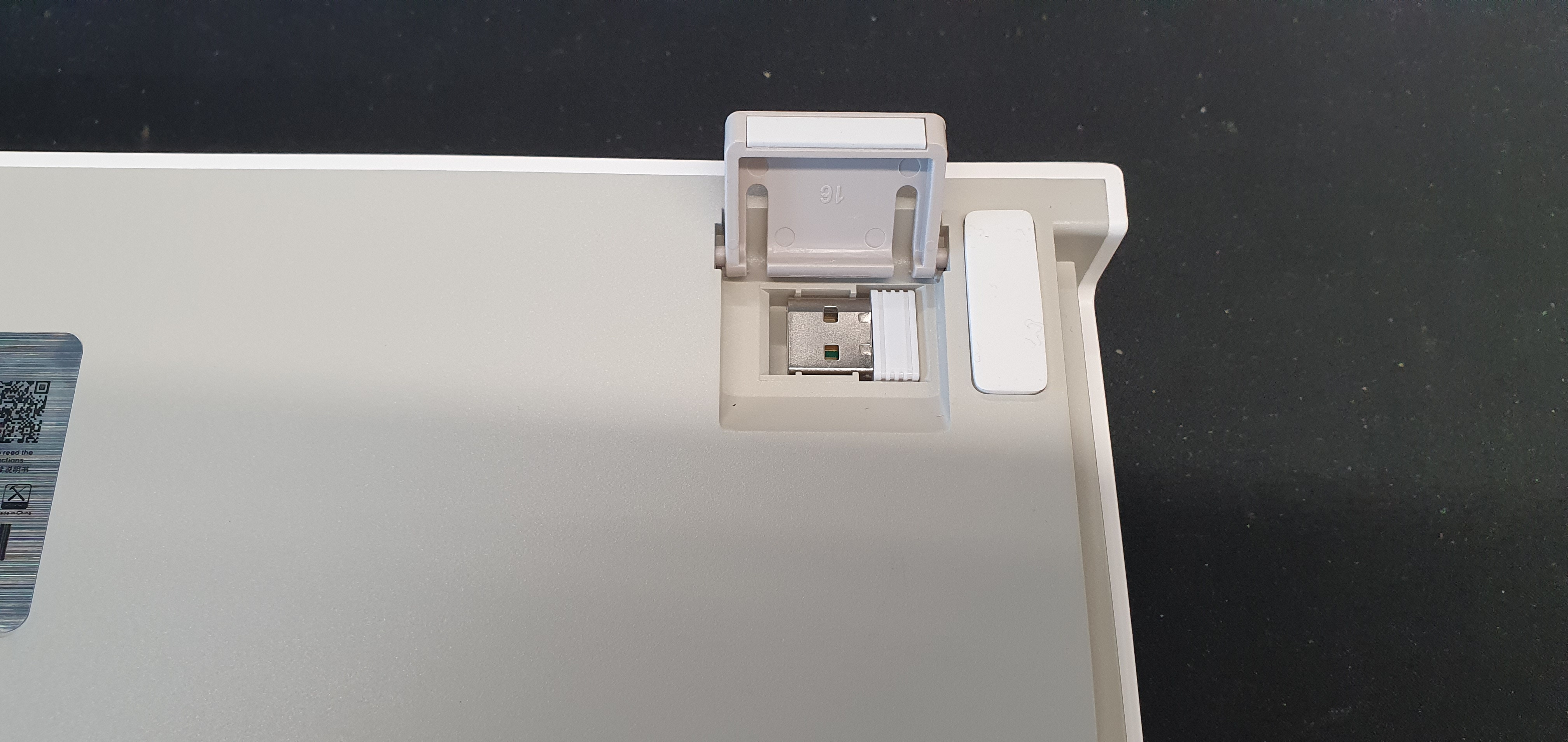 전용 무선 동글은 키보드 한쪽 높이 지지대를 열면 들어 있습니다. 문제는.. 이게 고정이 아니라서 지지대를 열어두면 무선 동글이 그냥 빠집니다. 흠.. 제가 너무 높은 품질을 기대했나요? 하지만 뭐 그러려니 합니다. 전 BT 연결해서 쓸 거니까요~