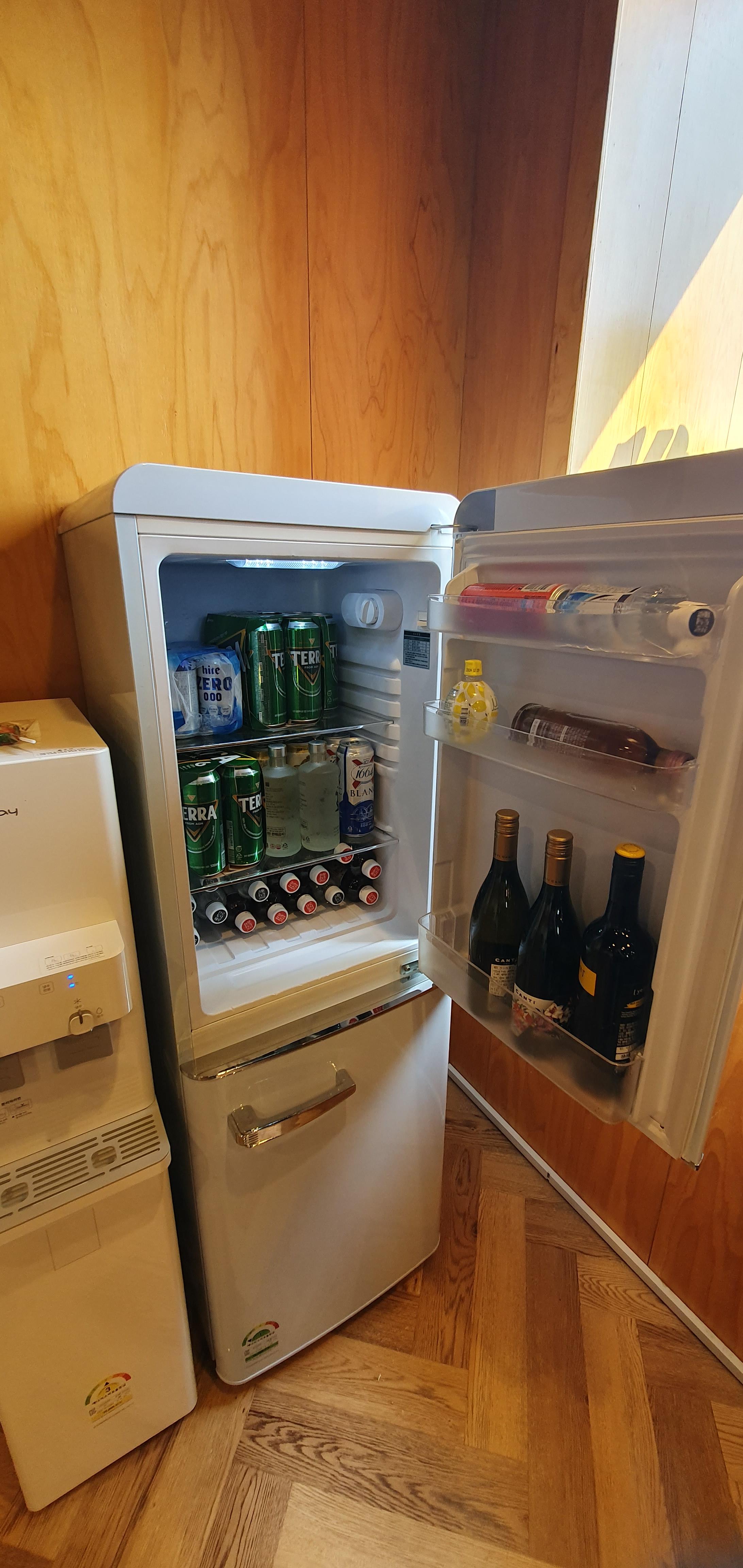 다시 2층으로 돌아와서 주방의 모습입니다. 바베규장이 따로 있기 때문에 싱크대와 냉장고정도가 준비되어 있습니다. 냉장고는 예쁜 걸 가져다 놓았는데 아쉽게도 용량이 너무 적습니다. 냉동, 냉장 모두 작기 때문에 술을 다 못 채워 넣었네요.ㅠ.ㅠ