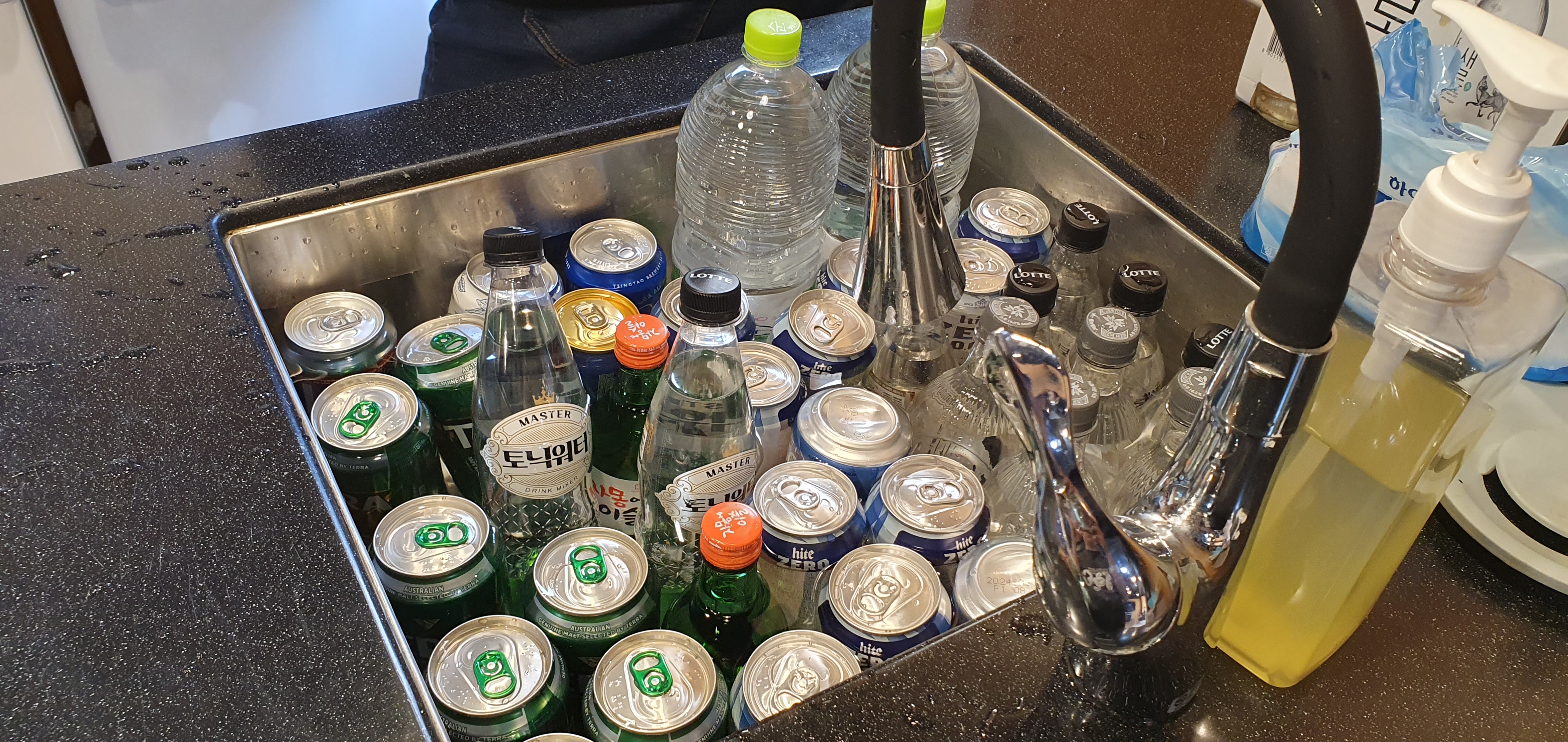 다행히 얼음도 충분히 사 왔기에 싱크대에 얼음과 물을 채워놓고 계곡처럼 술을 담가 놓았습니다. 술이 모자랄 줄 알았는데.. 남긴 했습니다. ㅋㅋ