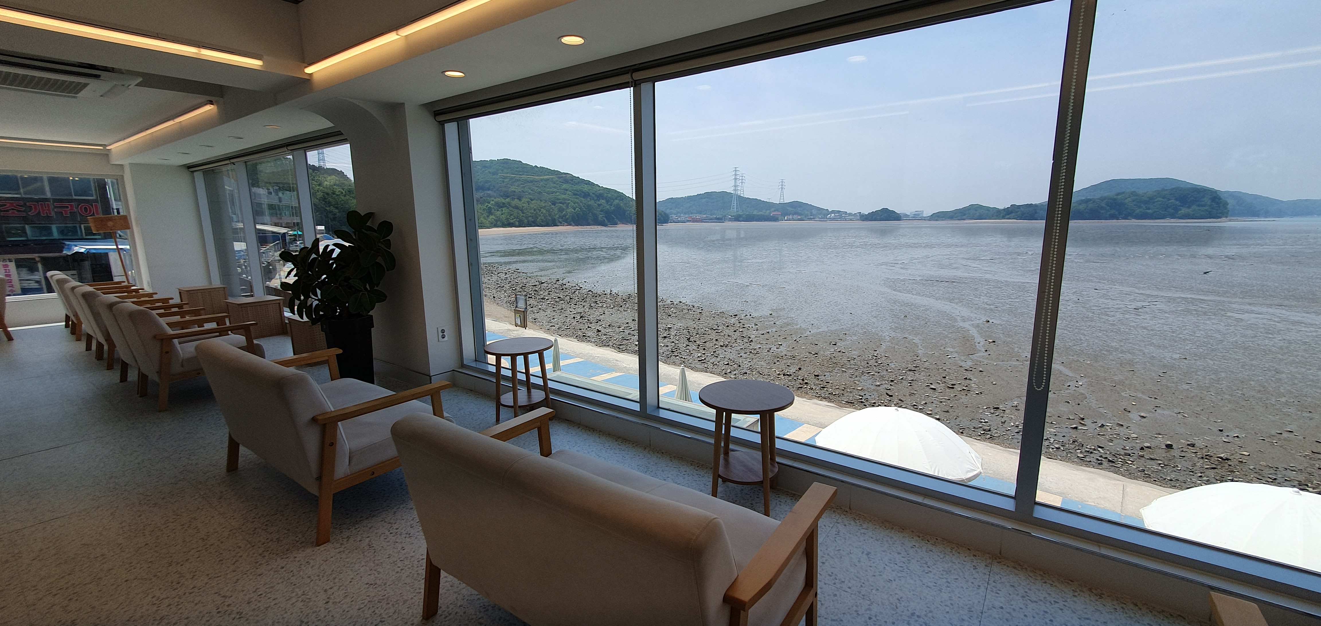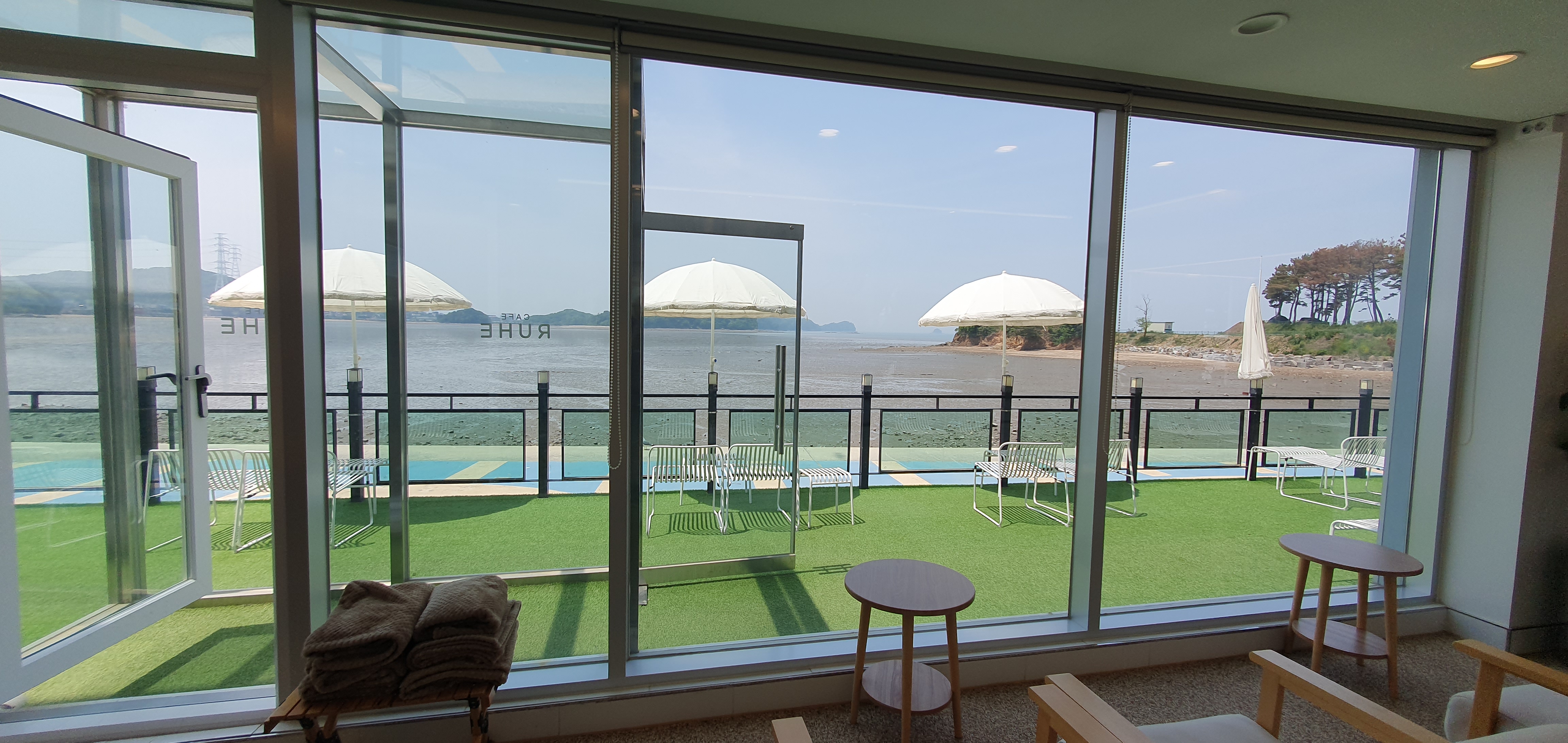 밖의 테라스에서 바다를 보면서 차를 마실수 있습니다. 통창으로 개방감있는 카페인데, 배경으로 바다까지 보이는 더할나위 없습니다. 다만..물때가 안맞아서 지금은 완전 썰물이군요..ㅎㅎ