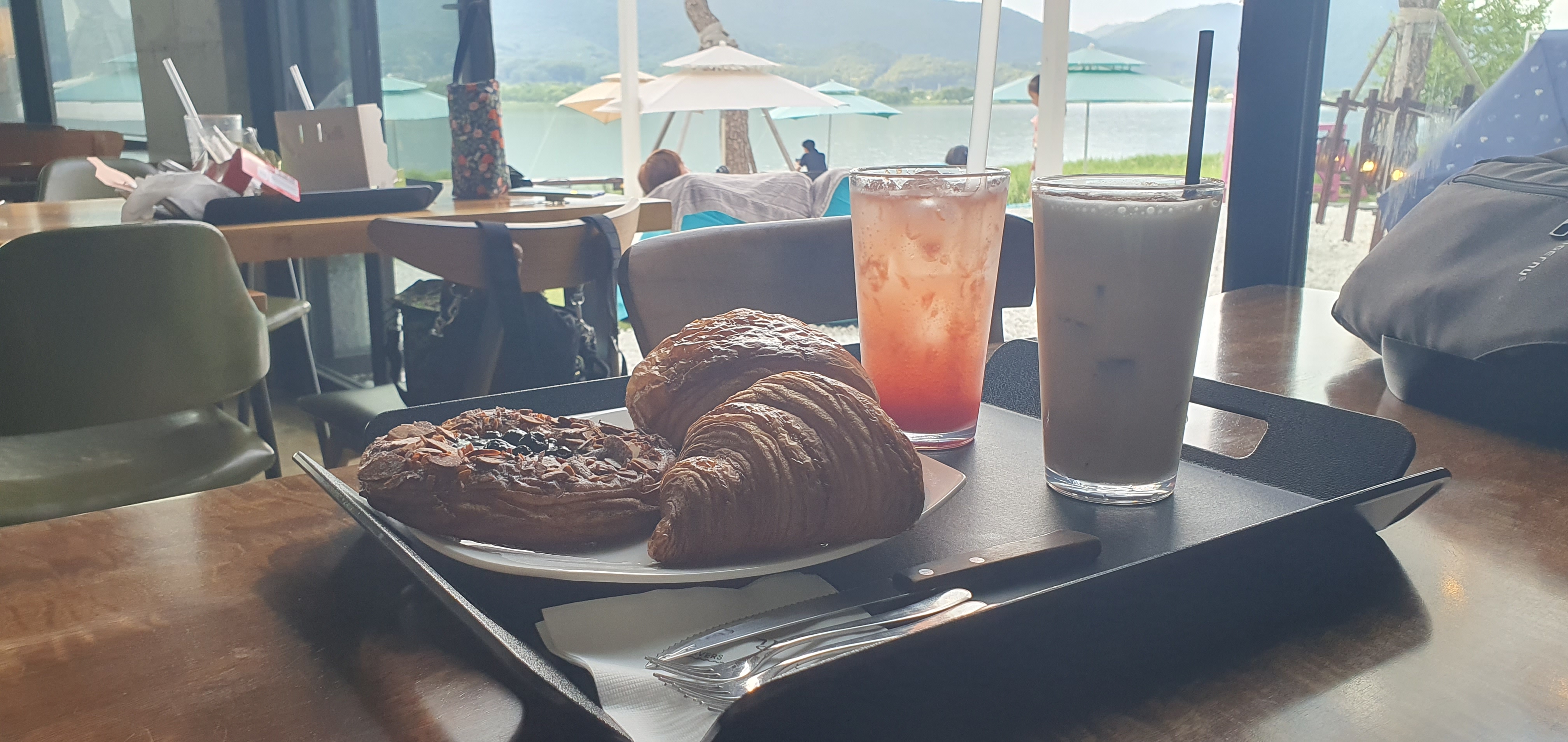 열심히 사진을 찍고나니 빵과 음료가 나왔습니다. 아무래도 뷰가 좋은 터라 가격은 꽤 있는 편입니다. 하지만 자리값을 받을만한 위치이고 넘실대는 강물을 보면서 멍 때리면서 잠시 속세의 번뇌를 놓고 있기에는 괜찮다고 봅니다.