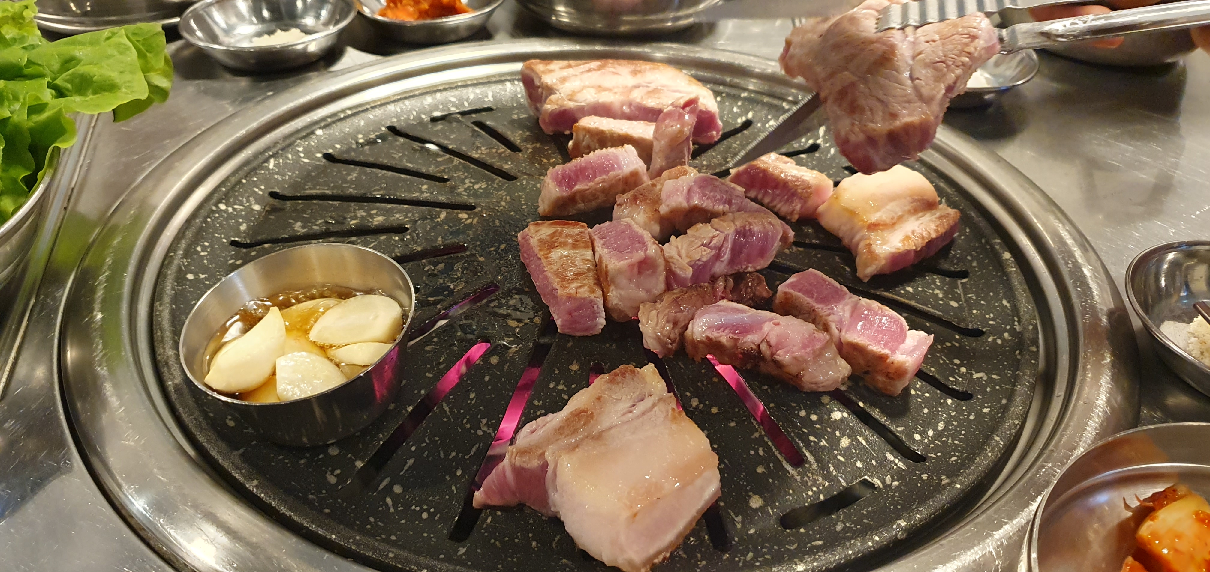 쓱쓱쓱 잘라서 착착착 세팅해 봅니다. 노릇노릇하니 고기가 참 맛있습니다. 제가 회사 근처에서 먹어본 고기집중에 가장 식감이 좋았던것 같습니다.