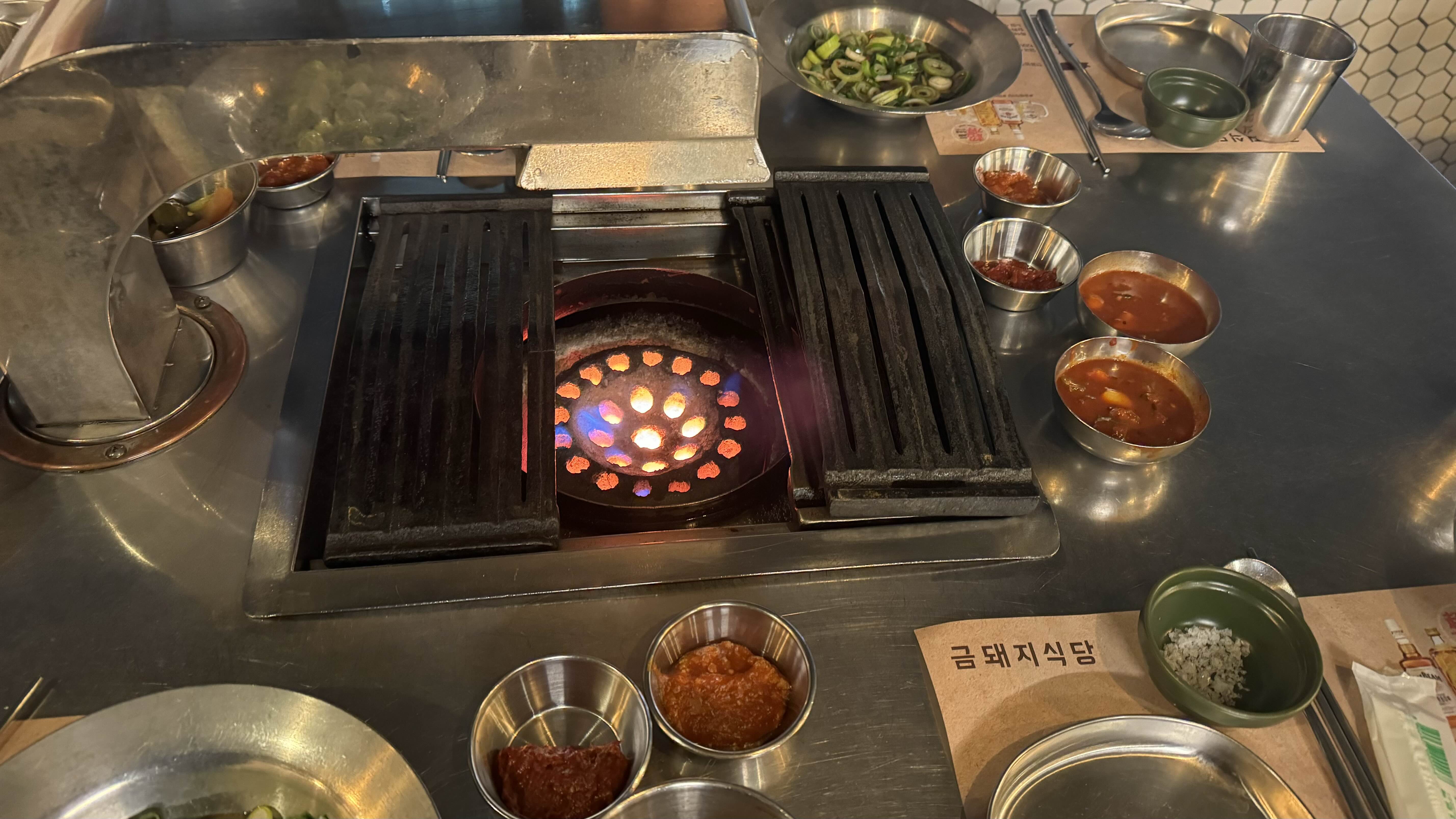 일단 불이 연탄이네요.. 송송 썰어넣은 파소스와, 기본찬이 먹음직 스럽습니다. 그리고 여긴 직원분이 직접 구워주시는 시스템이라 편합니다.