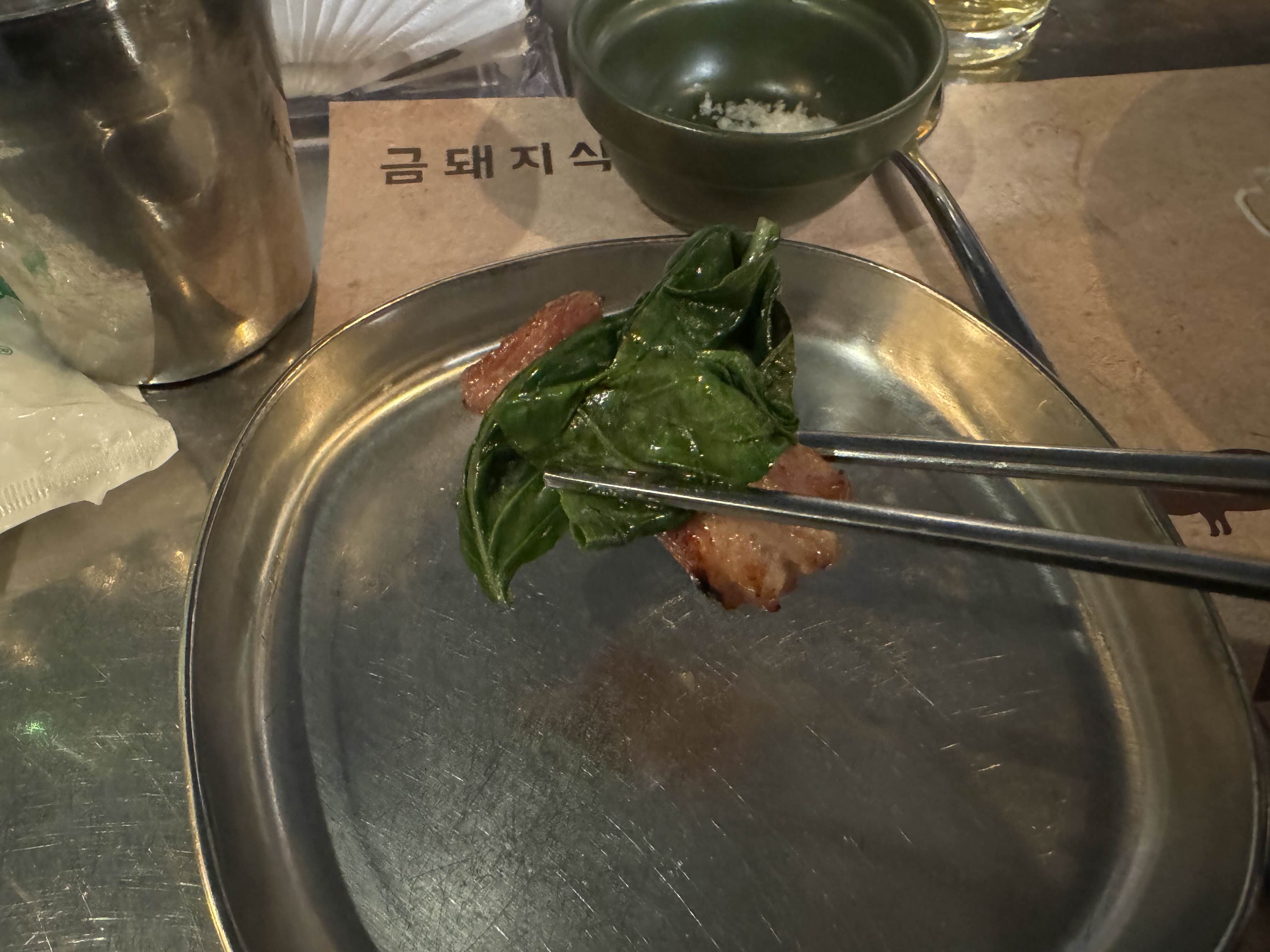 유명하다는 바질쌈도 싸서 한입 먹어 봅니다. (물론 바질은 추가해야 합니다.)