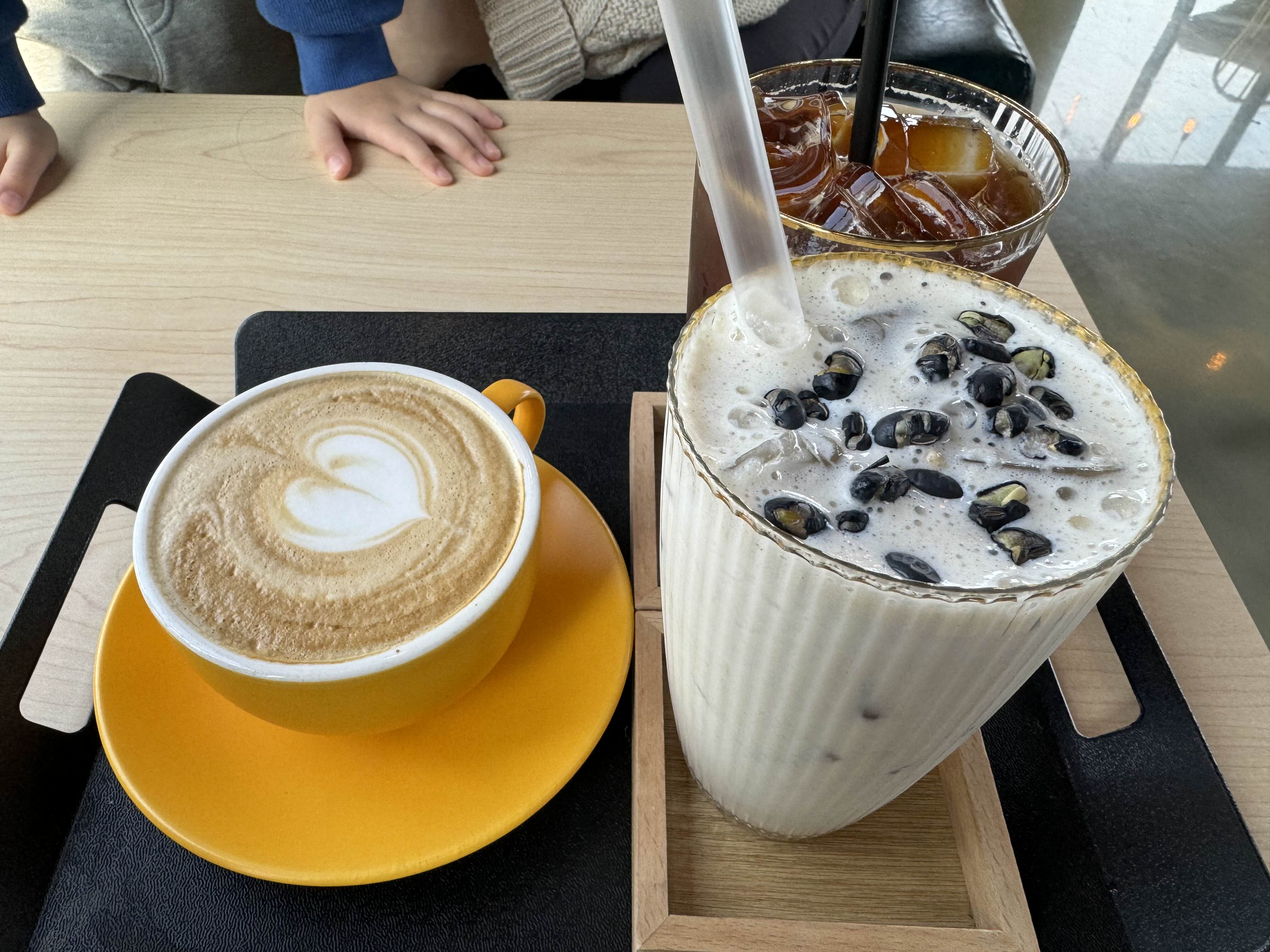 서리태 미숫가루와 라떼를 시켰습니다. 커피는 뭐 기본으로 먹어야 하니 시켰구요. 직원분이 애들을 보시고는 혹시 설탕 빼야 하는지 물어보시더군요. 설탕을 거의 빼고 주문했더니 단맛보다는 고소함이 느껴지는게..어르신의 맛....ㅋㅋ