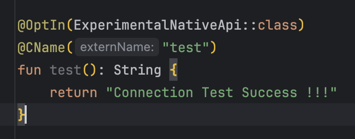 다만 KMP에서 만든 함수를 라이브러리로 만들어 외부에서 호출되도록 하는경우 빌드가 extern C로 되어야 하며, Top-level function을 권고하고 있습니다. MacOS와 Windows 모두에게서 호출되는 함수를 선언하려면 아래와 같이 함수를 선언해야 합니다.