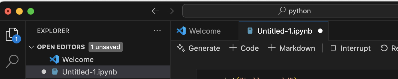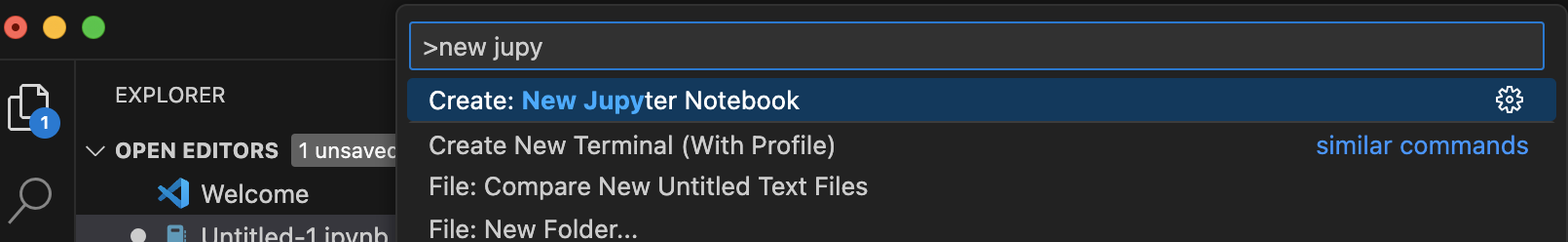 VS code에서 ipynb 파일을 하나 생성합니다. "Command + Shift + P"를 누르면 선택창이 뜨고, "jupyter"를 입력하면 "Create: New Jupyter NoteBook" 을 선택할수 있습니다.