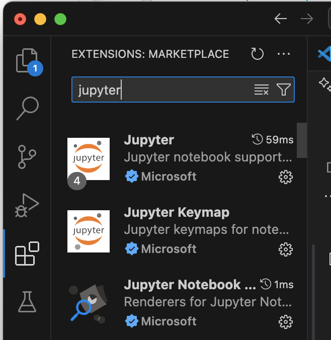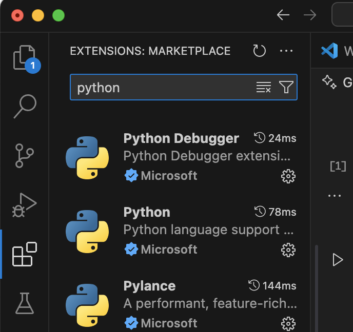 왼쪽에 네모 모양의 아이콘을 클릭한뒤 python을 설치 합니다.