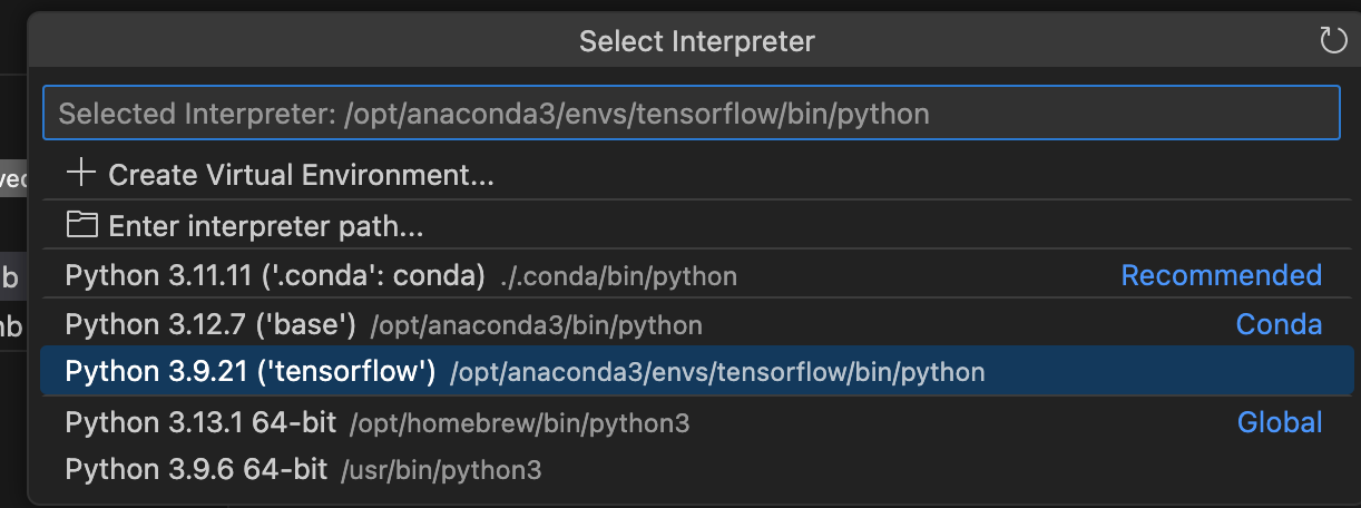 다시 "Command + Shift + P"를 눌러 선택창에서 "Interpre"를 입력하면 "Python: Select Interpreter" 을 선택할수 있습니다.