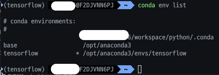 다시 한번 conda env list를 실행하면 위 그림처럼 tensorflow에 * 표시가 된것을 알수 있습니다.